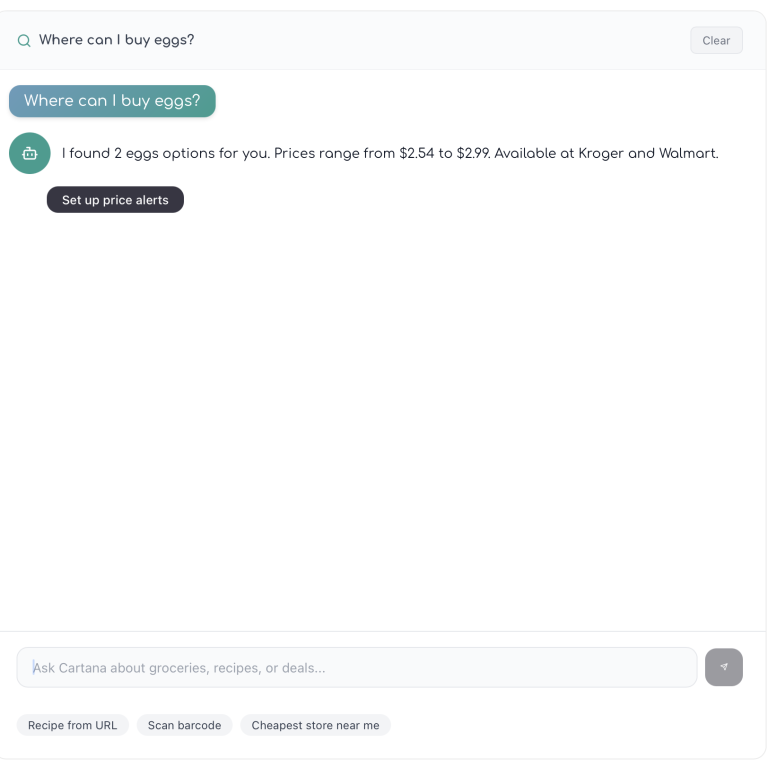 Instead of focusing on delivery, Cartana acts as a personal shopping intelligence system. It tracks real-time prices across multiple retailers, identifies the best opportunities to save, and helps people plan purchases so less food goes to waste.